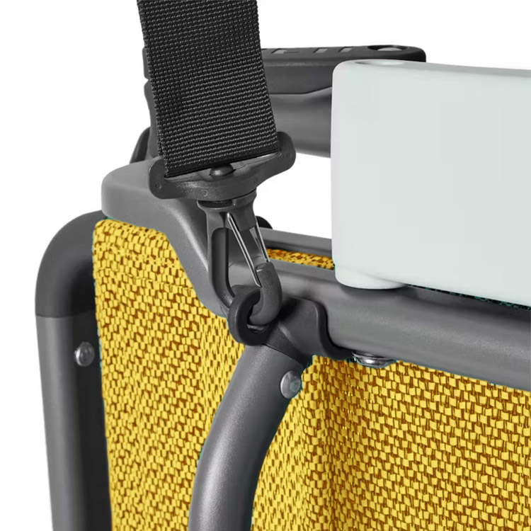 Komplekte yra patvarus, lengvas nešiojimo krepšys su dirželiu per petį, kad būtų lengva transportuoti. Sulenkta kėdė išlaiko ploną profilį, kuris puikiai telpa automobilio bagažinėse ir daiktadėžėse.