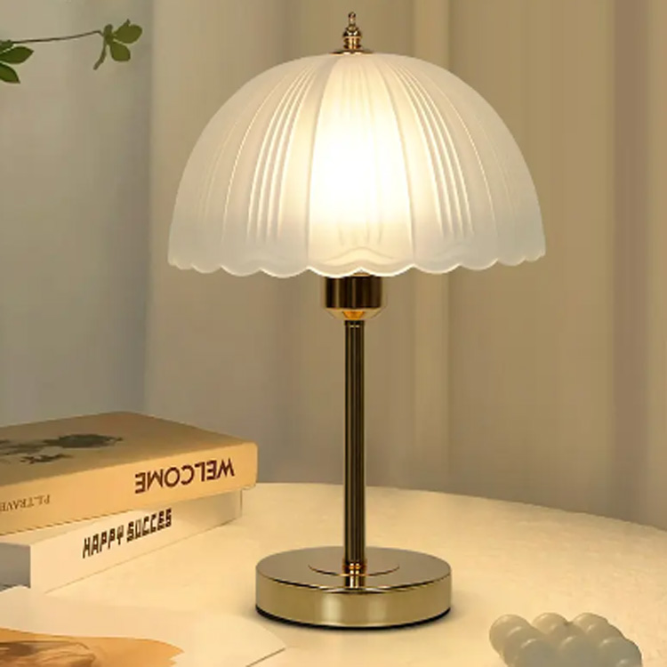 Prie miegamojo lovos pritemdomas minimalistinis šiltos šviesos stalinis šviestuvas. Tai vintažinio stiliaus stalinis šviestuvas su žalvariniu pagrindu ir kupolo formos matinio stiklo gaubtu. Elegantiškas dizainas suteikia švelnų aplinkos apšvietimą, todėl puikiai tinka miegamiesiems, svetainėms ar biurams, bet kuriai erdvei suteikiant retro žavesio.