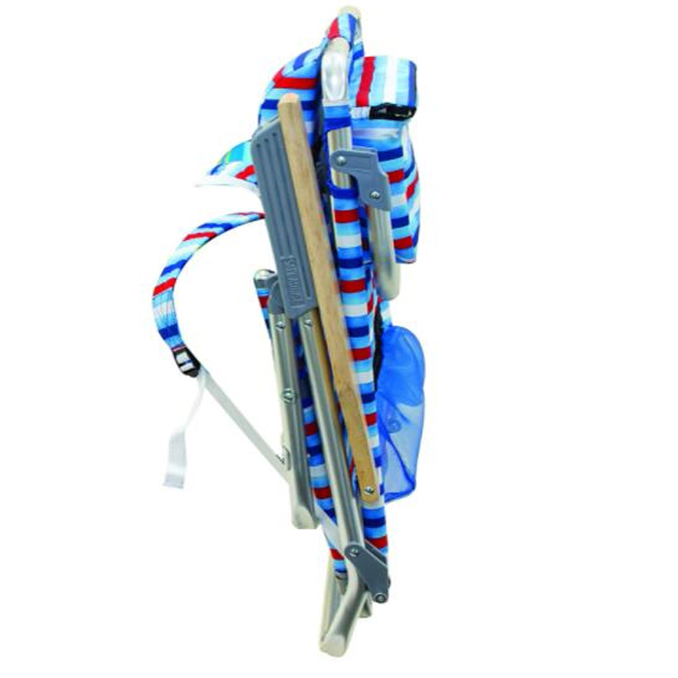 Klasikinio plokščio sulankstymo kuprinės stiliaus lauko paplūdimio kėdė. Kompaktiški, lengvi dryžuoto dizaino lauko baldai. Pagaminta iš prabangaus metalo aliuminio, užtikrinančio ilgalaikį komfortą. Idealiai tinka kelionėms į paplūdimį ir iškyloms. Galimos klasikinės raudonos, baltos ir mėlynos spalvos.