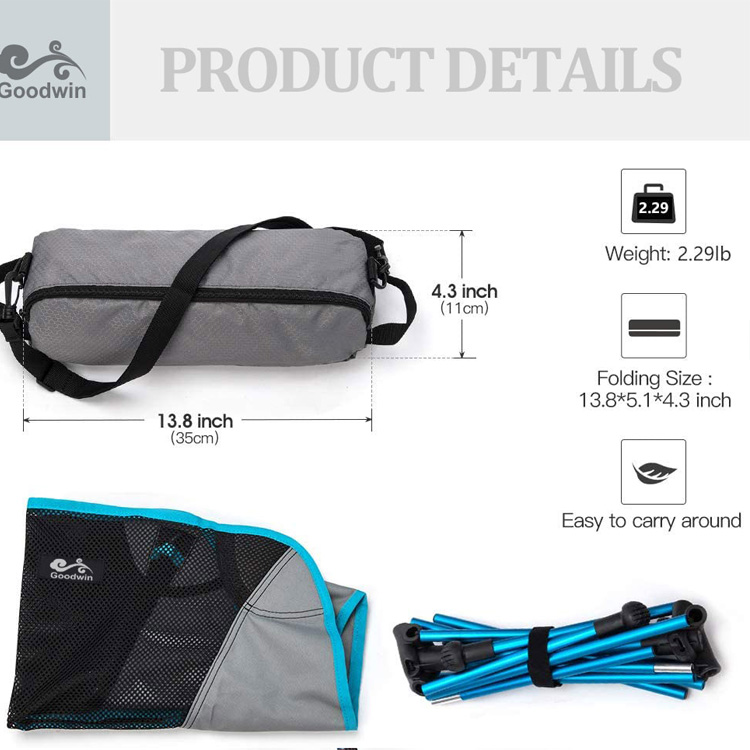 Itin lengva nešiojama kompaktiška sulankstoma stovyklavimo kėdė. Mėgaukitės komfortu bet kur su šia itin lengva nešiojama sulankstoma kėde. Kompaktiškas ir patogus nešiotis su patogiu laikymo krepšiu’Puikiai tinka kelionėms paplūdimyje, stovyklavimui, turistinėms kelionėms, žygiams pėsčiomis ar bet kokiems nuotykiams lauke, kur patogumas ir patogumas.