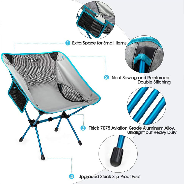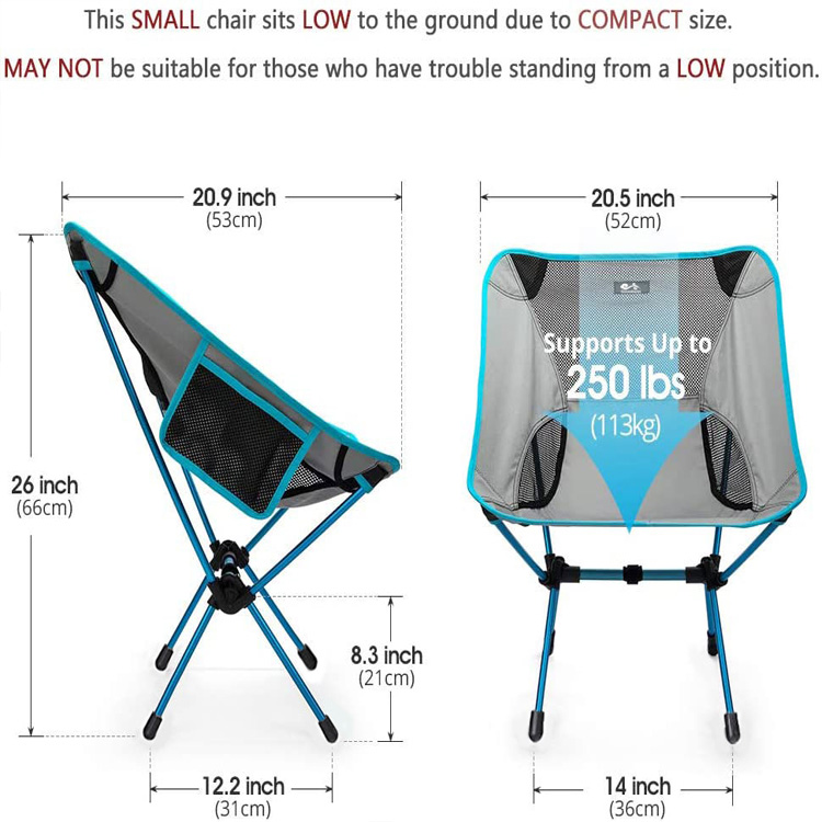 Itin lengva nešiojama kompaktiška sulankstoma stovyklavimo kėdė. Mėgaukitės komfortu bet kur su šia itin lengva nešiojama sulankstoma kėde. Kompaktiškas ir patogus nešiotis su patogiu laikymo krepšiu, puikiai tinka kelionėms paplūdimyje, stovyklavimui, kuprinėms, žygiams pėsčiomis ar bet kokiems nuotykiams lauke, kur patogumas ir patogumas.