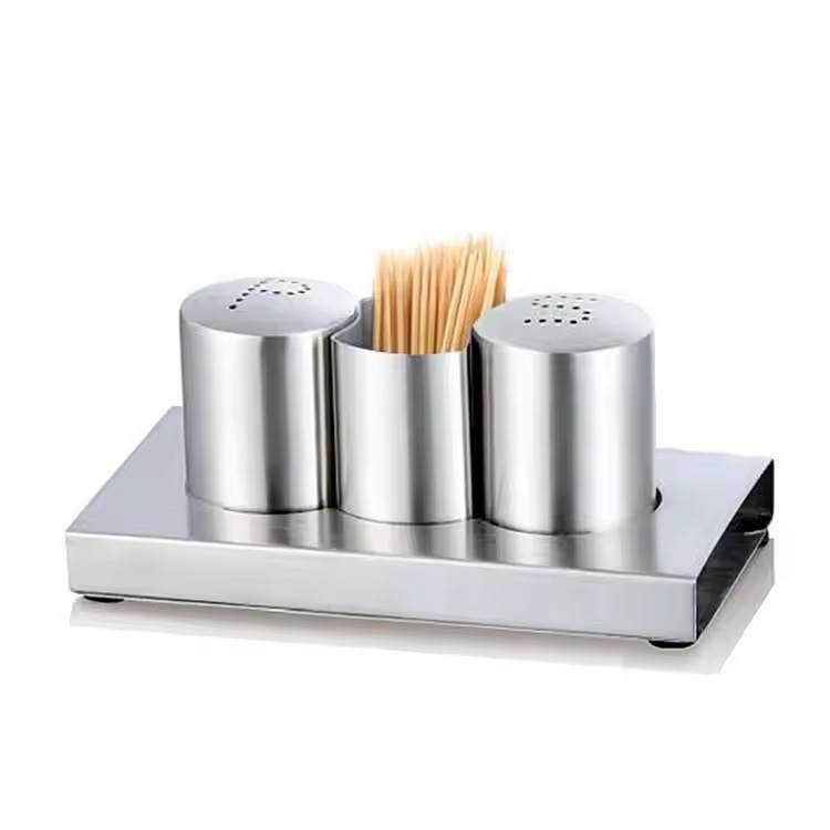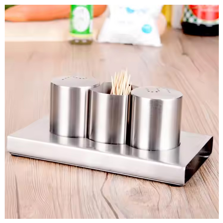 Į šį kompaktišką „3-in-1“ rinkinį įeina druskos ir pipirų purtyklės kartu su dantų krapštuko laikikliu, tvarkingai sutvarkyti būtiniausius stalo pagardus. Puikiai tinka taupyti erdvę ir tobulinti funkcionalumą ant virtuvės prekystalio ar valgomojo stalo.